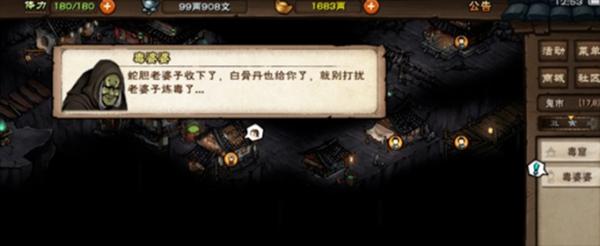 4、毒婆婆在鬼市场景的(17.8),收集炼制白骨丹的材料,材料分别为骨头×40、虎骨×20、鹿茸×5以及人参×5。另外还需要10副蛇胆作为报酬;