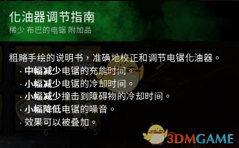 之前上面说技巧的时候,有一个拉锯逼走位就说需要拉锯加移速的配件就是这两个,当巴布带上这配件以后配合上减充能,甚至有不亚于电锯的压迫能力,是一个可以大幅度提升你的配件,当然需要你一定的熟练度技巧,当你玩巴布到了非常熟练的地步时候,基本上就是带这一个加指南书