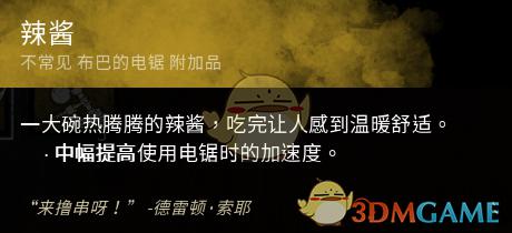 很多人都知道了,紫配辣酱有BUG没有加速度提升只有发疯时间加长,所以大家千万别使用,用电锯的加速度就是在开始挥舞时候的冲刺速度.