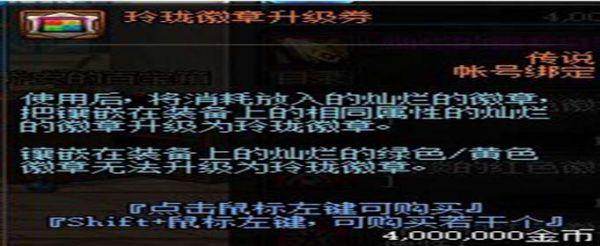 1、在达芙妮的商店中购买获得,每个玲珑徽章升级卷的价格是400W金币;