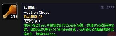 4、效果:在27秒内恢复874.8点生命值,进食必须保持坐姿,如果进食至少10秒,则提高8点耐力和精神,持续15分钟。