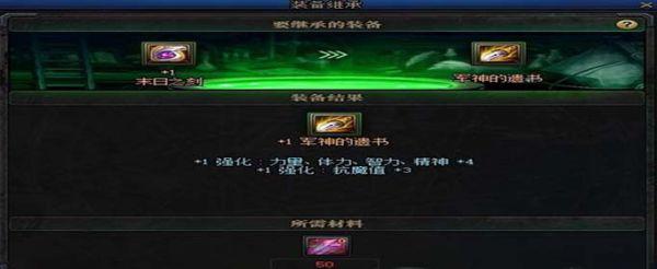 1、装备继承所需的材料是堇青石,每次继承需要50个,且只有100级的装备才可以使用装备继承系统;