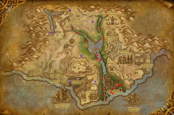 蓝点为友善羊驼刷新点,红点为基萨尔灌木丛刷新点。