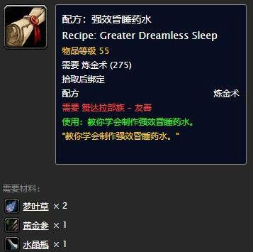 1、玩家可以在商人林沃斯处购买到强效昏睡药水配方,需要赞达拉声望达到友善,价格为5金币;