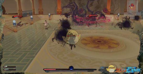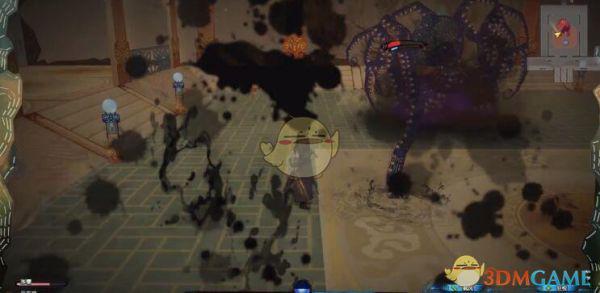 BOSS战开始后,场上会有两个触须,需要先清掉。触须会施放两个技能,一个是拍地横扫,一个是喷墨水。拍地横扫是两个动作,先拍地后横扫。不可格挡,要用位移闪开。触须喷的墨汁是一个黑色球,一次会喷好几个,可以防御,不过防御只能抵挡伤害,被墨汁击中还是会导致屏幕上出现墨渍。
