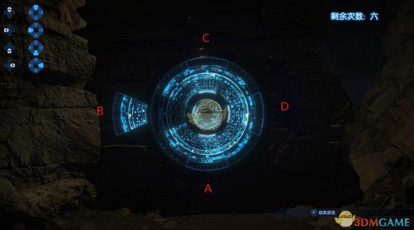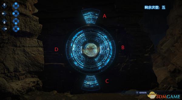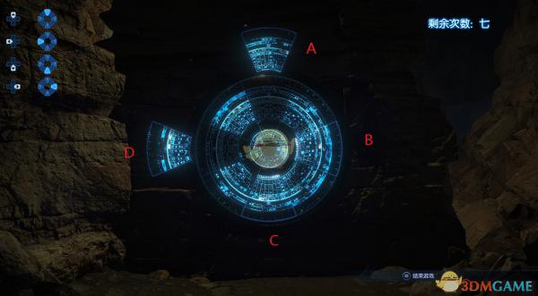 刚刚打开的时候,我们看到这样一个图案,需要知道的是,你动任意一个箱子,会使其本身以及另外的两个箱子一起移动,也就是说,假如我移动了A,那么变化的可能就是ABC(移动一个箱子带动其顺时针的两个箱子一起变化)、ABD(移动一个箱子带动其两侧的箱子一起变化)、ADC(移动一个箱子带动其逆时针方向的两个箱子一起变化)这三种情况,同时每一局的移动规律是固定的,也就是说假如第一次采取了ABC这种形式,在你的7次机会没用完之前都是采取的同样的模式,这就方便我们找规律了~