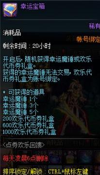 开启后,可以从幸运魔锤1个、幸运魔锤3个、幸运魔锤5个、200欢乐代币券、600欢乐代币券、1000欢乐代币券中,随机获得1个。