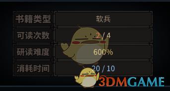 书籍研读时会出现以上属性,消耗时间固定为10,可读次数自不必说,一但用完这本书就会消失( 这什么鬼设定,话说用完?) 。