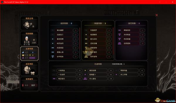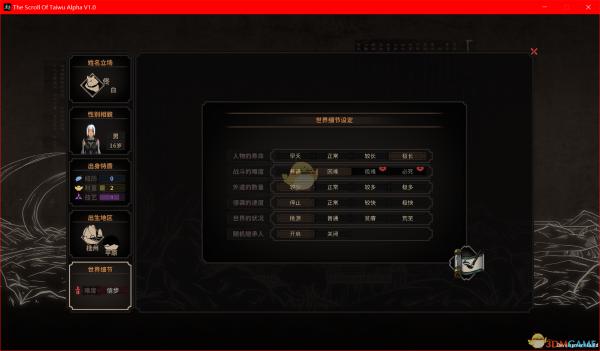 在难度方面我将外道和侵袭调成了停止,除了战斗难度可以说都调到了最低的等级, 充分的说明了笔者到底有多菜,毕竟我要开的是一个可以称得上是手无缚鸡之力的书生号。各位可以根据自己的游戏水平调整相应的难度,但是我要提醒各位,修炼技艺是一个需要投入非常大量时间的工程,而在我们修炼技艺的前期,角色可以说是几乎没有战斗力的 (战五渣)。