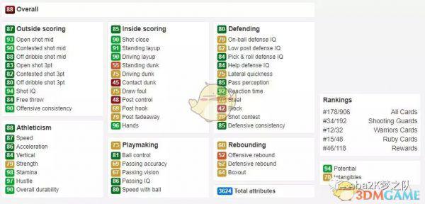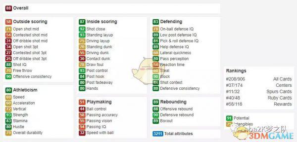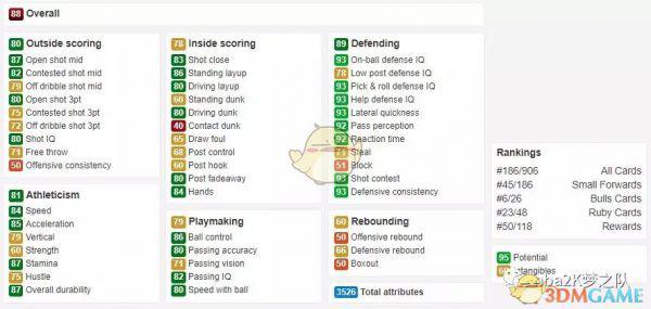 最后来聊聊“花大虫”吧,这张卡其实并不强,推荐他主要还是因为情怀。罗德曼几乎只有篮下扣篮(站扣95)一种得分手段,而且碍于身高的硬伤(2米),让他很难发挥出自己最强的篮板能力,这也是2K一直以来难以解决的问题。不过高达99满分的拼抢积极性还是很符合罗德曼一贯打球风格的。