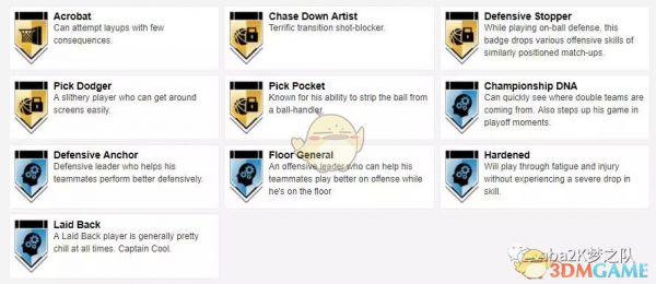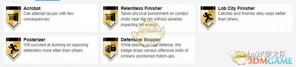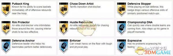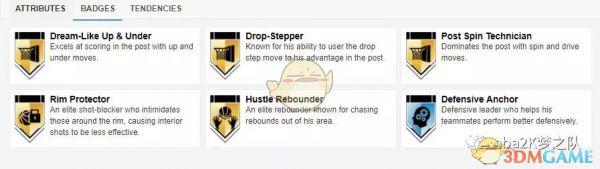 徽章方面,吉尔摩的5个金章为:上下假动作高手、沉底步高手、背转身达人、护框精英和精英篮板手。