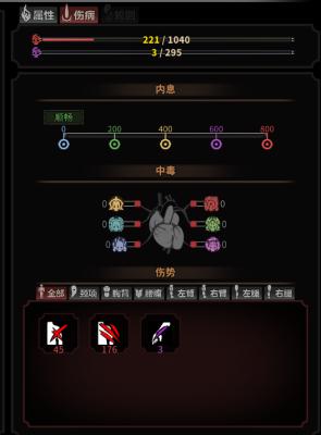 伤病系统包含内外伤条、内息、中毒、伤势。