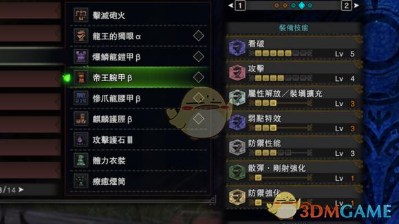 这套配装再打比较大的怪挺舒服 LV3的散弹不容易空 体型小的怪打弱点LV3散弹分布太大 反而效果欠佳因此有以下配装