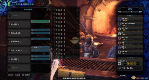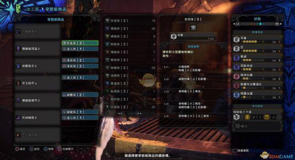 虽然这里只发动了匠2,但由于有明灯三件套的技能“利刃”,效果是斩味消耗减半,所以这里的匠可以看做是4级,冥灯衣服带了2级,强化持续对棍子来说非常有用,能减少吸灯次数,增加输出频率。腰部的属耐2级最好插一颗珠子满级,可以有效防止水、冰等对耐力影响较大的异常。手部带的减轻胆怯能有效防止队友干扰。