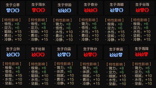 《太吾绘卷》当中影响人物属性的其中一个因素就是年龄,不同的年龄会影响人物的各方各面,包括人物的属性,人物的特质,地图的行动力等等,所以在任务年龄以及出身的时节的选择上,也是需要玩家考虑的一点,那么在这里就为大家列出人物在各个不同时节出身时的特质。