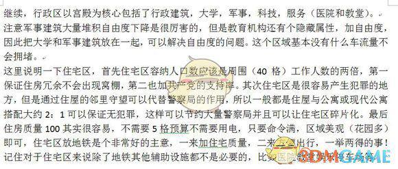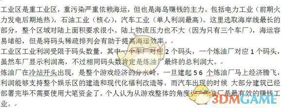 农业区包括了16个水耕农场,8个巧克力,牧场,奶酪(满足gjzy支持率的)大量超市和运输公司,这里的道路是比较拥挤的(特别是十字路口),但是基本不会出现生产中断的情况。注意减少生产廉价的农产品比如香蕉等是解决拥堵的另一个思路。这个区域其实利润不大,不要也不是用来赚钱的,纯属提供人口工作的,住宅区放在中间不会引起堵车,因为路上主要跑的还是货车,另外纯出口型工业海上没有运输压力。