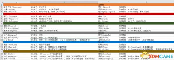 注意3: 表格中,每一大类里面,增益和减益的强度,是按照从上到下的顺序排列的