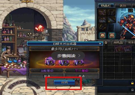 4、买来后,找到合成器鼠标点击右键使用,将卡片放入到合成器中,紫卡推荐三张一起合,添加好卡片点击合成;