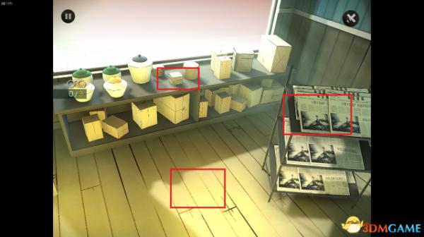 观察右边的蔬果店货架,再进入烟草店,先观察门边橱窗:地板、报纸、架子。