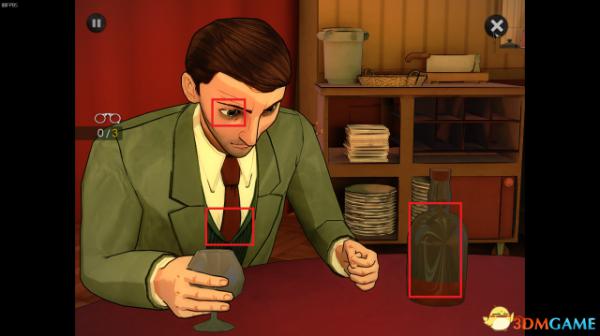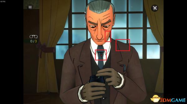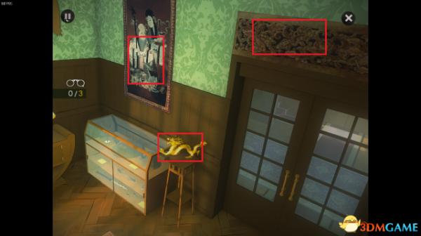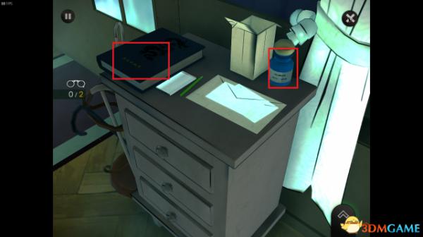 接着查看柜子正面四个角,转动鸟的图片听得机关的声音就表示位置正确,全部转好后打开柜子(5侦探点),观察柜子里:一封信和一瓶止咳药(2侦探点)。