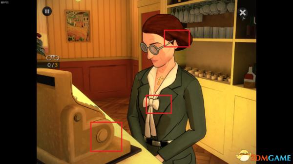 进入餐厅前还有单独看看左边报刊亭,进入餐厅先观察播放机和餐桌还有黑斯廷斯,再观察老板:红头发、外表、收银机。