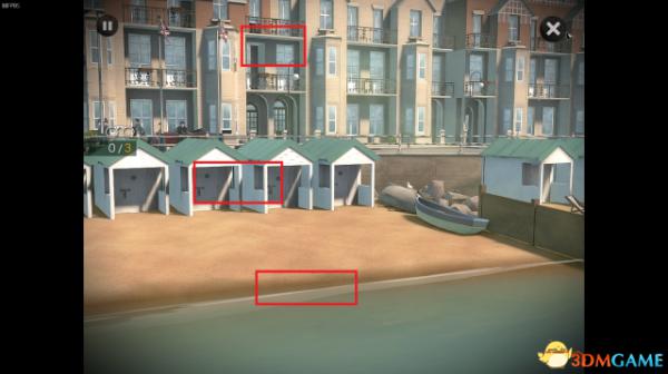 上楼梯向左,先观察建筑:屋顶、报亭、海滩。
