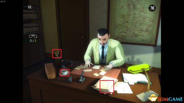 再观察观察黑斯廷斯,来到门口,捡起地上的信,再照照镜子(3侦探点),回到书桌前打开风扇(1侦探点),先坐到扶手椅上(1侦探点,获得成就:小猫打盹),接着点击书桌开始对比字母。