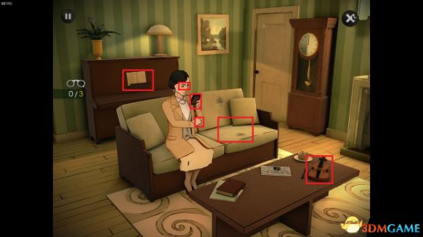 进入贝蒂房间先照照镜子(3侦探点),观察房间右下角:乐谱、麦克风、节拍器。查看贝蒂的床上的裙子和丝袜,观察丝袜旁的邀请函:舞会邀请、酒会邀请和电影票,查看贝蒂的床头柜:喉咙药和盒子获得小钥匙,观察墙上的唱片封套,接着查看柜子上的钟开始解谜。