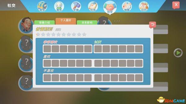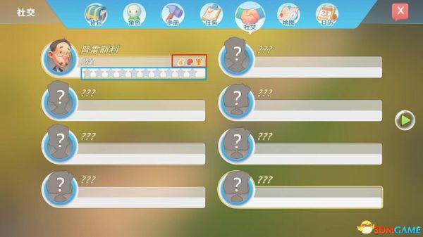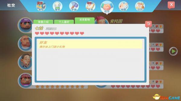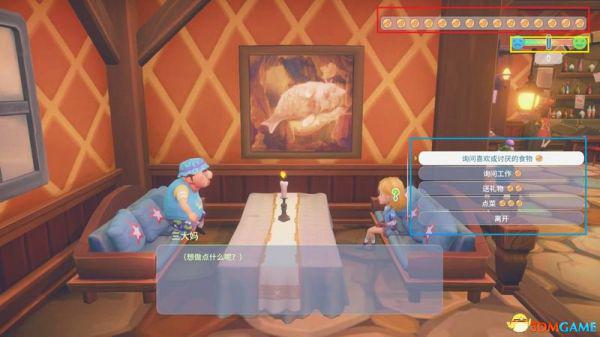 人物蓝框中的星星代表他对你的好感度,上方红框中的项目则是可以进行的互动(有些可以提升好感度)。