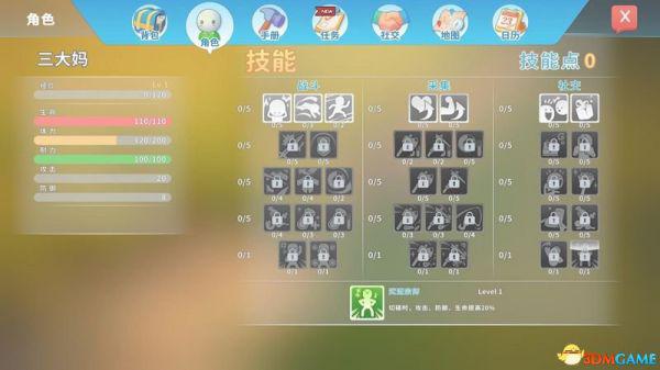 角色界面除开之前介绍的级别、生命和体力外还有重要的技能树系统。