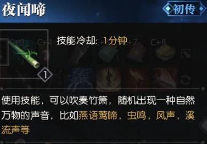 技能(夜闻啼),使用技能可以吹奏竹萧,随机出现一种万物的声音。
