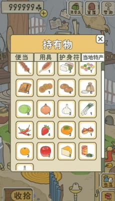 桌子上可以放上蛙下次出门要带的东西,这样你没来,他也可以自己带上你准备好的东西出门。左上食物两个,右上护身符类物品两个,下面一排可以放4个道具类。不用必须全部填满。放好以后就不要点那个日语按钮了,那个是重置,也就是说把你刚放上去的东西一键撤销。放好了不管就行了。